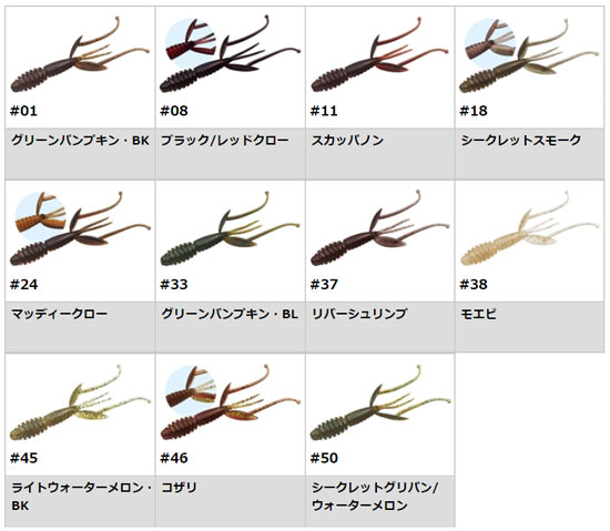 名作C-4シュリンプのテナガエビサイズが登場。福島健の世界では、2.8インチは子供のエビ。3.5インチはメスエビ。そしてこの4.2インチはオスのテナガエビでベイトタックル用である。他のサイズ同様、シルエットで喰わせるというコンセプト。
