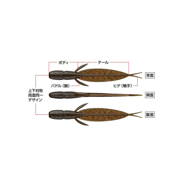 ボディサイズに対して長くて幅が広いリーチテールは、精密成型による薄さがもたらすテロテロ感、プリプリ感と相まって、わずかな水流や極軽シェイクでも揺らめきバスにアピールします。