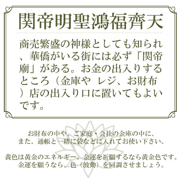 ◇金属製で金色のカードに「関帝明聖鴻福齊天」の絵柄が施されております。