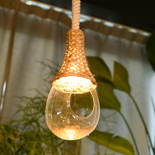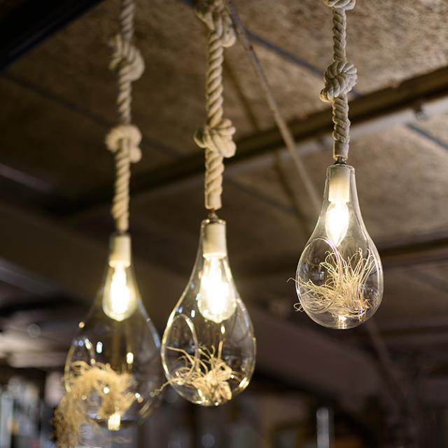 しずく型のガラス、結び目がアクセントになったコットンコード、細かい部分もこだわり感のあるおしゃれな照明です。