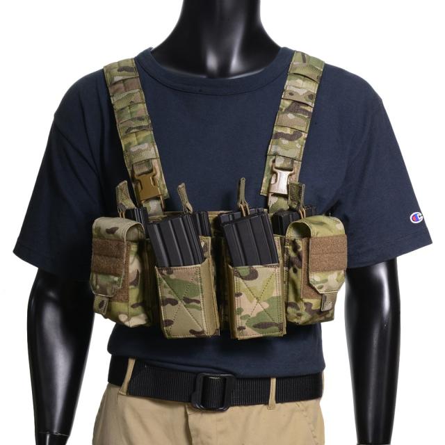WARRIOR ASSAULT SYSTEMS社のパスファインダーチェストリグです。単独でも使え、同社のリコンプレートキャリアと組み合わせる事も出来ます。正面中央のオープントップポーチはM4マガジンを保持、正面両サイドには小型ユーティリティポーチ、後列は4本のタブ付きバンジーコードでM4マガジンやAKマガジンを収納。