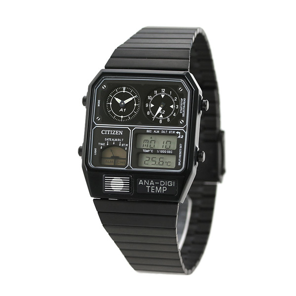 正規品 7年保証キャンペーン 送料無料 シチズン アナデジ テンプ クロノグラフ クオーツ ユニセックス メンズ レディース 腕時計 JG2105-93E CITIZEN ANA-DIGI TEMP アナデジ ブラック ◆1980年代に登場し、当時大ヒットモデルとなったアナデジテンプ。アナログとデジタルを組み合わせたメカニックなデザインだけでなくクロノグラフやアラーム、 温度計、カレンダーなど機能性も抜群。当時、時刻を表示するだけでなく、温度を測るセンサー機能を時計に盛り込み「ニューサイエンス」 の分野を切り拓いたといわれた話題のモデルの再登場。レトロフィューチャー好きにはたまらない時計です。 発売日:18年11月発売 レコードレーベル RECORD LABEL