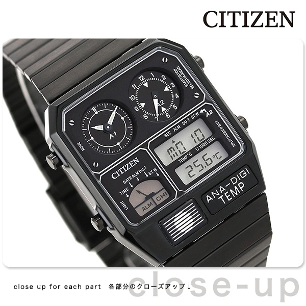 正規品 7年保証キャンペーン 送料無料 シチズン アナデジ テンプ クロノグラフ クオーツ ユニセックス メンズ レディース 腕時計 JG2105-93E CITIZEN ANA-DIGI TEMP アナデジ ブラック ◆1980年代に登場し、当時大ヒットモデルとなったアナデジテンプ。アナログとデジタルを組み合わせたメカニックなデザインだけでなくクロノグラフやアラーム、 温度計、カレンダーなど機能性も抜群。当時、時刻を表示するだけでなく、温度を測るセンサー機能を時計に盛り込み「ニューサイエンス」 の分野を切り拓いたといわれた話題のモデルの再登場。レトロフィューチャー好きにはたまらない時計です。 発売日:18年11月発売 レコードレーベル RECORD LABEL