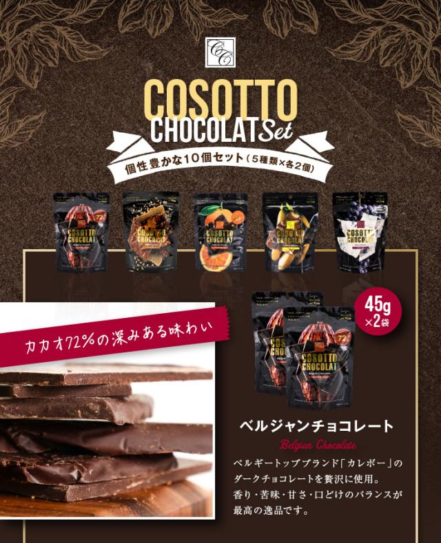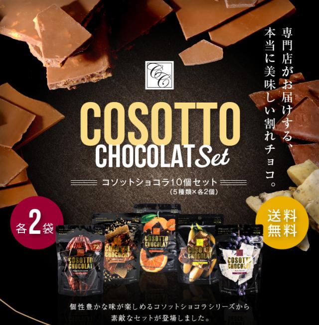 コソットショコラ10袋セット 割れチョコ 訳あり チョコレート お菓子 チョコレート菓子 高級チョコ カカオ72% オレンジ バナナ ラムレーズン ワッフル 割れチョコレート ダークチョコレート ホワイトチョコ クランチ 小袋 まとめ買い 送料無料