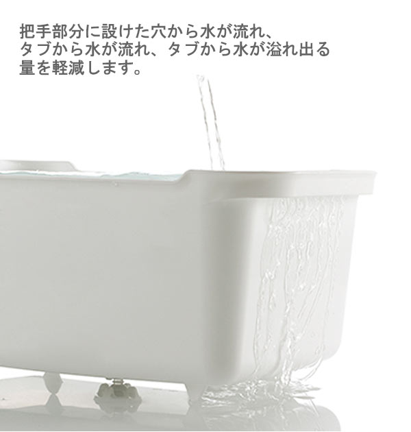 | 商品説明 | こぶりな洗い桶。底の排水栓を押したり、引っ張るだけで簡単に水をためたり、排水したりできます。水の入った重い桶を持ち上げて、ひっくり返さなくても楽々排水できます。その他、把手部分設けた穴から水が流れ、タブから水が溢れ出る量を軽減します。逆さにして水切りする際も、空気が通るよう隙間を設けてあります。 |