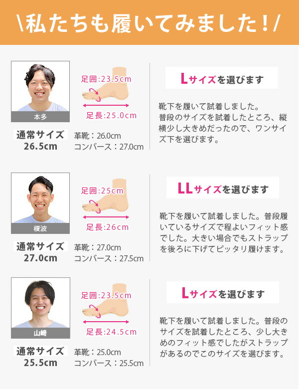 | こちらの商品は【標準サイズより大きめ(幅広3E相当)】です。 普段お履きのサイズより0.5cm小さいサイズをオススメします。 幅広設計なので、甲高・幅広の方も0.5cm小さいサイズをオススメします。 【男性スタッフKAI(172cm) 普段のサイズは、革靴27.0cm/日本製スニーカー27.5cmです】 私のジャストサイズはLL[26.5cm-27.0cm]でした。靴下を履いて、程よいフィット感のあるサイズです。 (個人差もございますので、目安とお考えください。) |