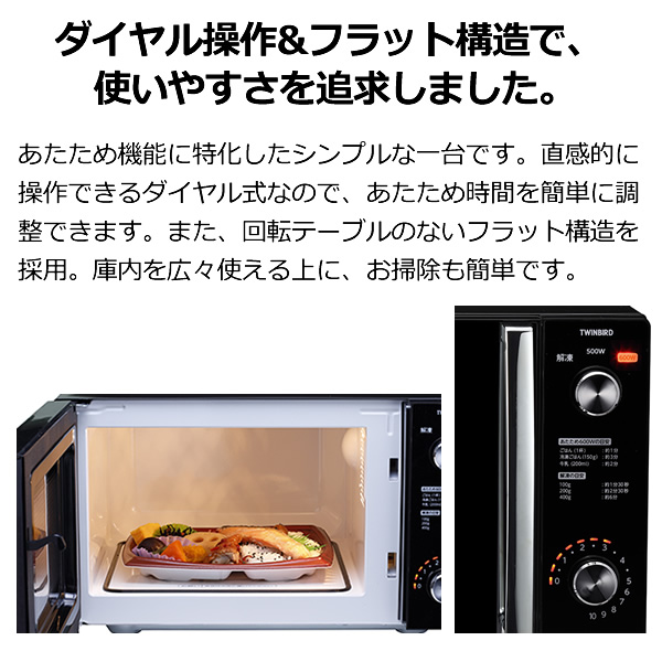 関連ワード:電子レンジ 単機能レンジ フラット庫内 フラットテーブル ミラーガラス 20L あたため 解凍 ダイヤル式 操作簡単 シンプル 調理家電 キッチン家電 コンパクト 一人暮らし 二人暮らし 新生活 ツインバード TWINBIRD DR-D278 DR-D278B ブラック