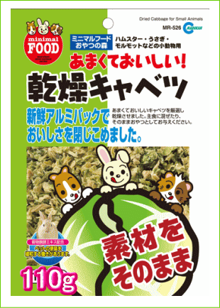 乾燥キャベツ110gあまくておいしいキャベツを乾燥させました。主食に混ぜたり、そのままおやつとしてお与え下さい。対象動物 :リスハムスターうさぎ・モルモット等の小動物 ※モルモットは体内でビタミンCを生成できません。乾燥キャベツでビタミンCを補給しましょう。 メーカー:マルカン(072-931-0345)原産国:中国