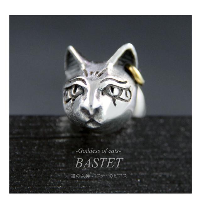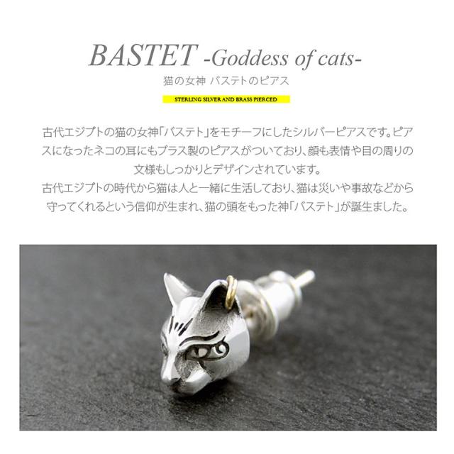 古代エジプトの猫の女神「バステト」をモチーフにしたシルバーピアスです。ピアスになったネコの耳にもブラス製のピアスがついており、顔も表情や目の周りの文様もしっかりとデザインされています。古代エジプトの時代から猫は人と一緒に生活しており、猫は災いや事故などから守ってくれるという信仰が生まれ、猫の頭をもった神「バステト」が誕生ました。