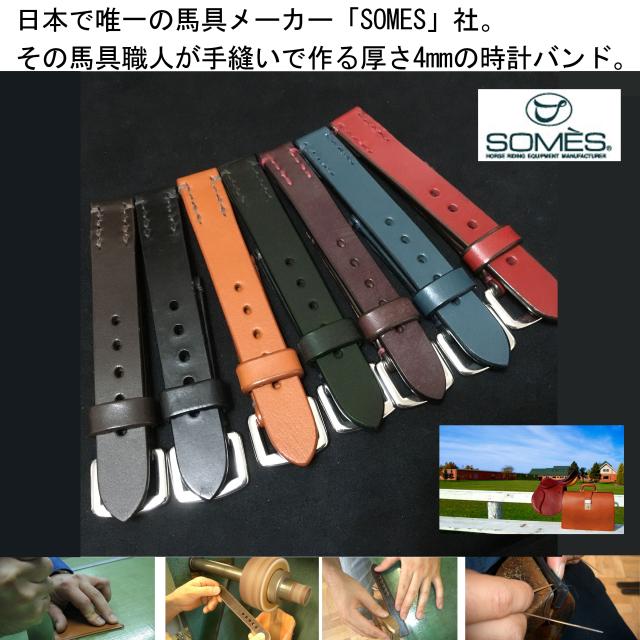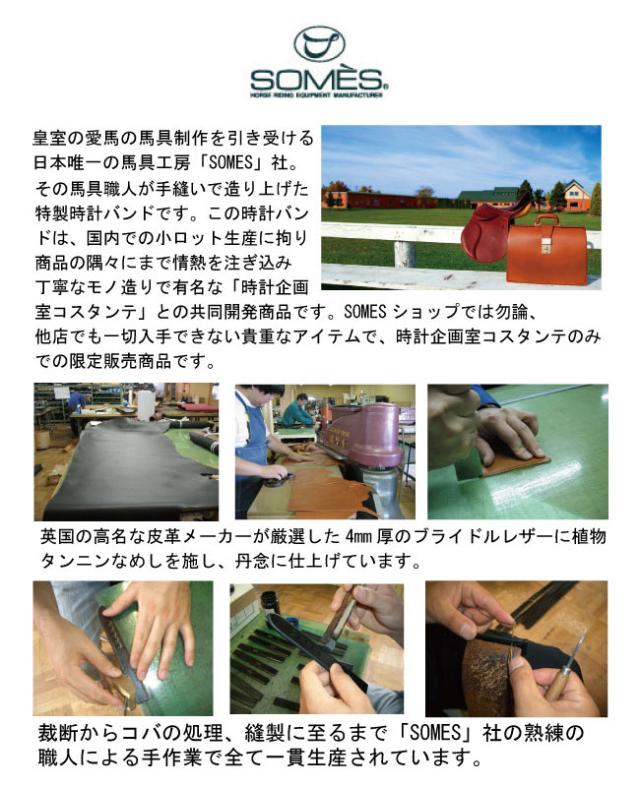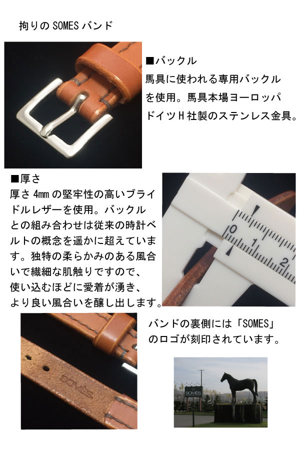 日本で唯一の馬具メーカーSOMES社から生まれた馬具職人手縫いの時計ベルト。世界初のブライドルレザー(馬具専用革)の時計ベルトで当企画室との共同開発です。SOMESショップでは勿論、他店でも一切入手できない貴重なアイテムです。当企画室のみでの限定販売となります。