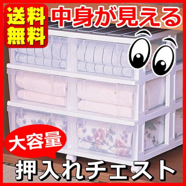 押入れ下段にピッタリ!!移動に便利なキャスター付きのチェストです。引出し1つあたりの収納目安はTシャツが約20枚、Yシャツが約8枚、バスタオルなら約4枚です。引出しが透明なので、中に収納しているものが一目で分かり取り出しやすいです。移動に便利なキャスター付。