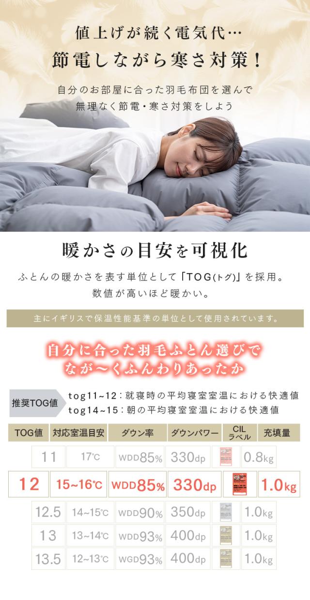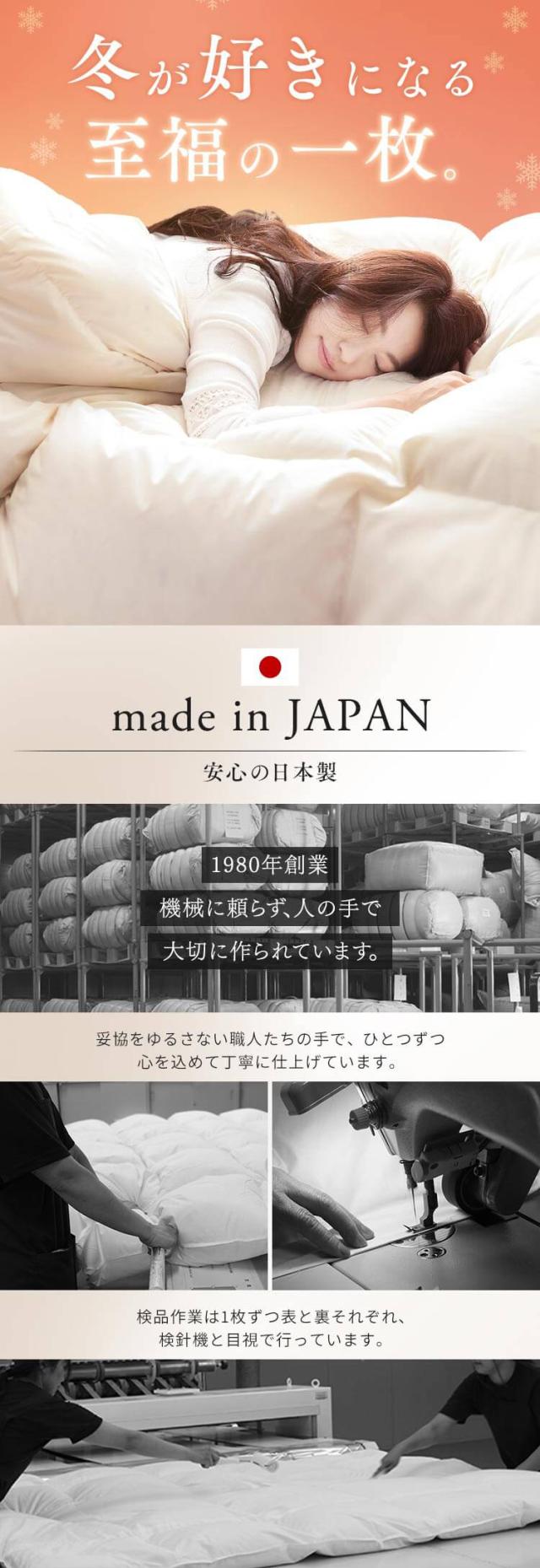 - 去年、羽毛を買いそびれてしまいこちらの商品のレビューを見て購入しました。 85%ダウンを使用しているだけあり、ペラペラではないしとても暖かいようで満足しているみたいです。また購入する機会があればこちらで購入したいです。