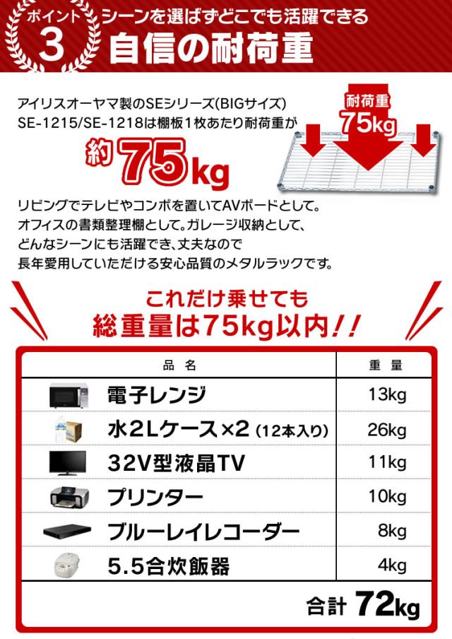 ●耐荷重(約):全体:300kg / 棚板1枚あたり:75kg