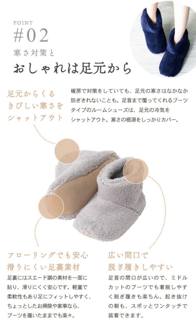 足首までカバーできるルームブーツです。裏面は、滑り止めのスエード加工済み。