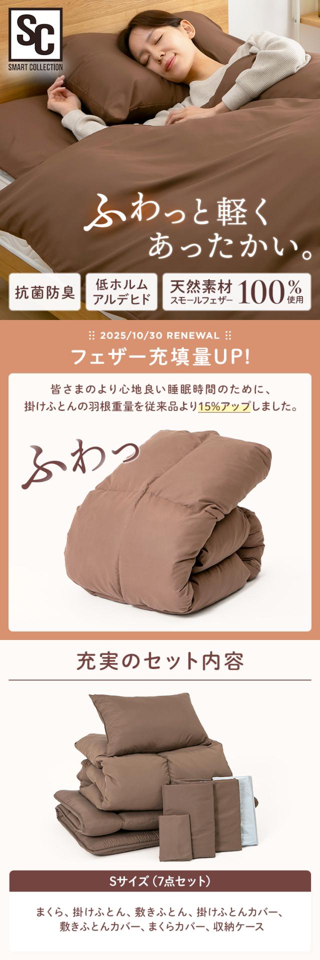厳選スモールフェザー100%、掛け布団・敷き布団・枕・枕カバー・掛け布団カバー・敷布団カバー+収納袋のお得なセットです。