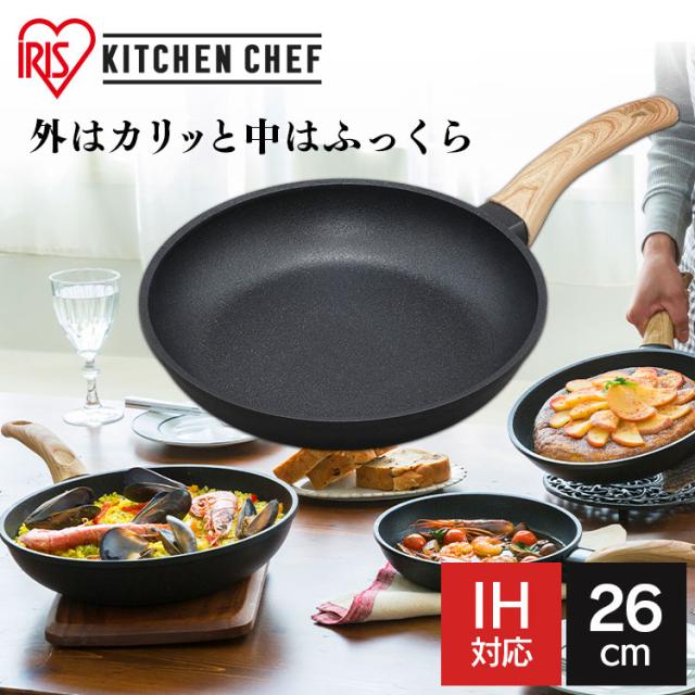 フライパン 26cm ih対応 アイリスオーヤマ * SKL-26IH ih ガス火 お手入れ 簡単 コーティング 使いやすい 片手鍋 おしゃれ アルミ製 丈夫 長持ち ハンドル 取っ手 木 木製 こびりつきにくい 収納 底厚 軽量 スキレット風 アウトドア キャンプ