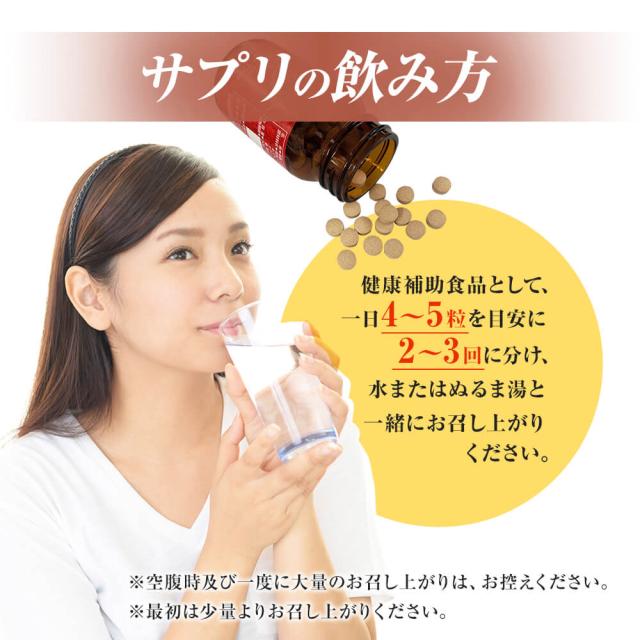 | ●健康補助食品として、一日4〜5粒を目安に2〜3回に分け、水などと共にお召し上がりください。 ●空腹時及び一度に大量のお召し上がりは、お控えください。 ●最初は少量よりお召し上がりください。 |