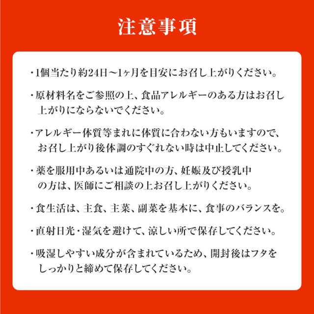 | ●1個あたり約24日〜1ヶ月を目安にお召し上がりください。 ●原材料名をご参照の上、食品アレルギーのある方はお召し上がりにならないでください。 ●アレルギー体質等まれに体質に合わない方もいますので、お召し上がり後体調のすぐれない時は中止してください。 ●薬を服用中あるいは通院中の方、妊娠及び授乳中の方は、医師にご相談の上お召し上がりください。 ●食生活は、主食、主菜、副菜を基本に、食事のバランスを。 |