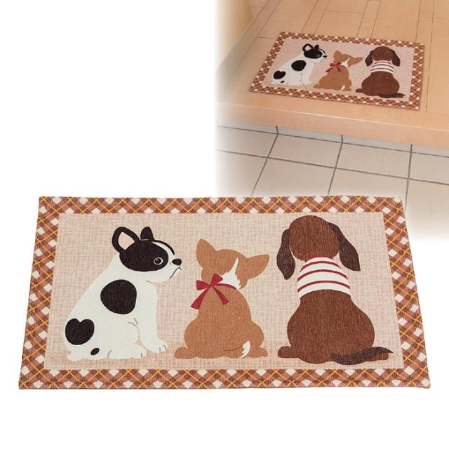 玄関の上り口に使っていただけるデザインマットです。生地はシェニール糸で仕上げていますので、適度な毛並で足さわりが心地よく、素足で歩きたくなるような感触。カワイイ3匹の犬が描かれ、見た目でも癒される感じが人気。裏側はスベリ止め加工済み。手洗いもご家庭で可能です。