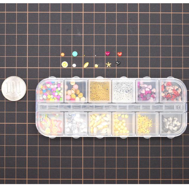 ■商品説明:12種類のキラキラスタッズパーツです。カラーが色々あるのでお好きなカラーを選んでアクセサリー作りが楽しめます!レジンアクセサリーやネイルにも大活躍です♪