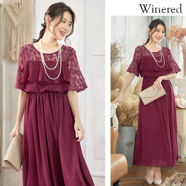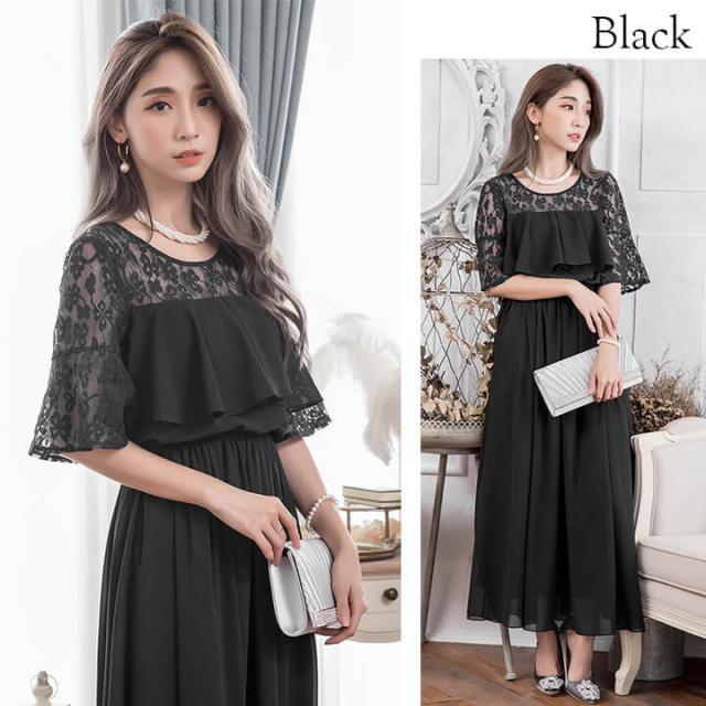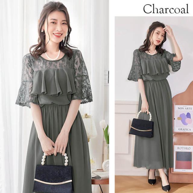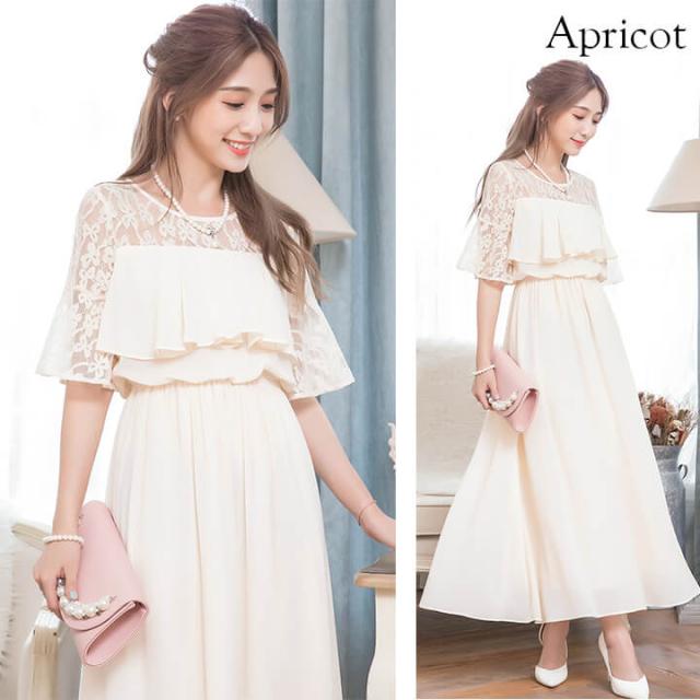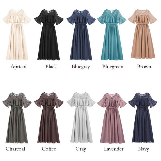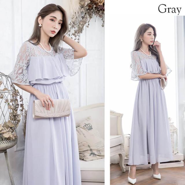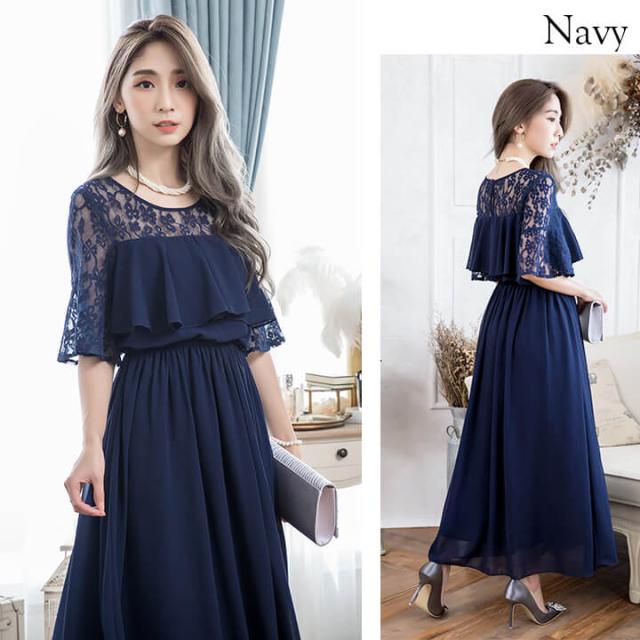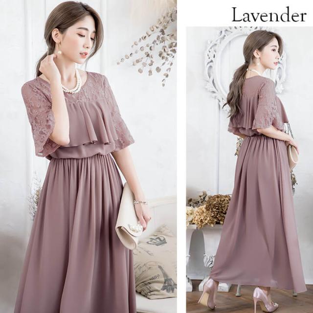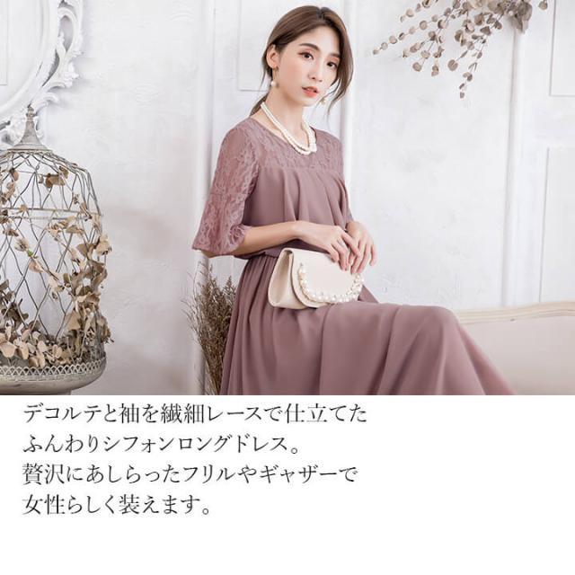 デコルテと袖を繊細レースで仕立てたふんわりシフォンロングドレス。