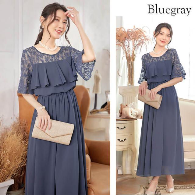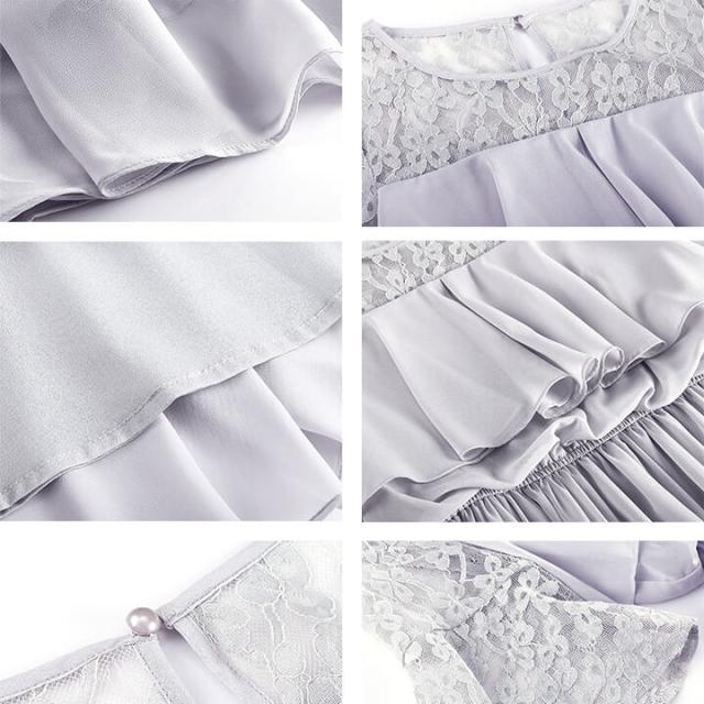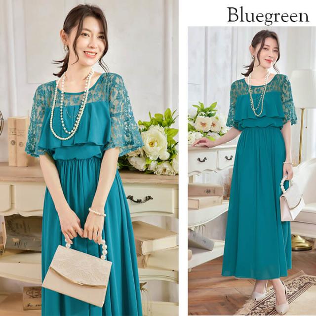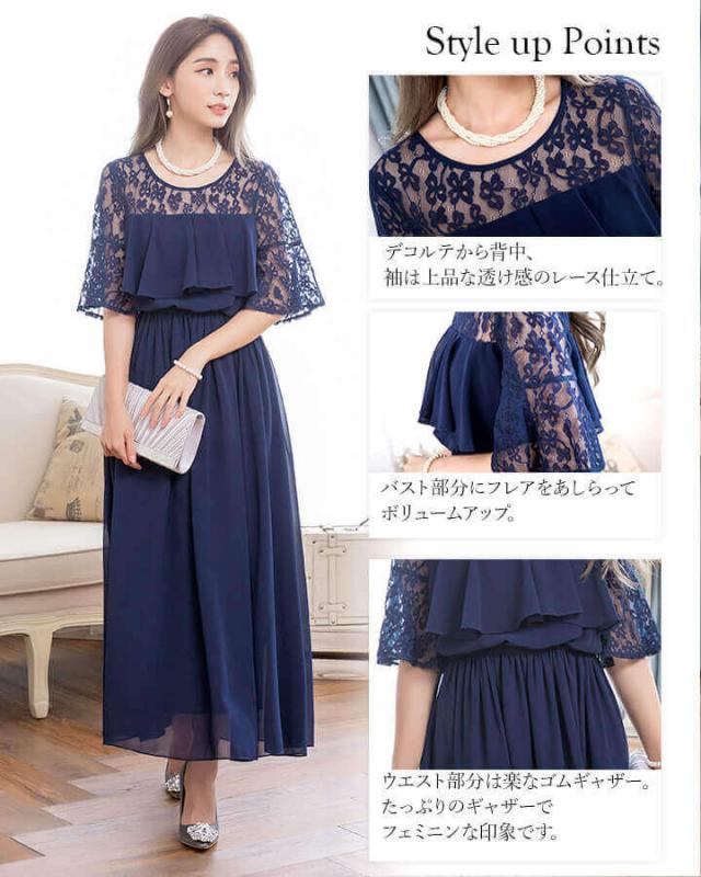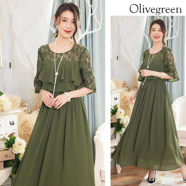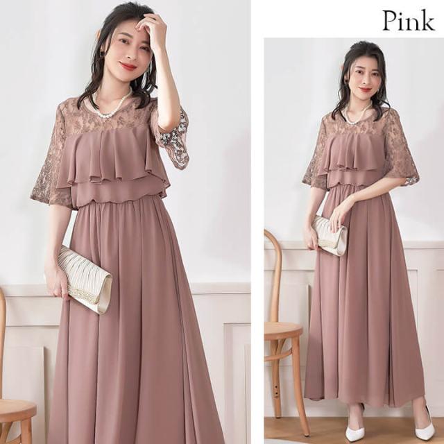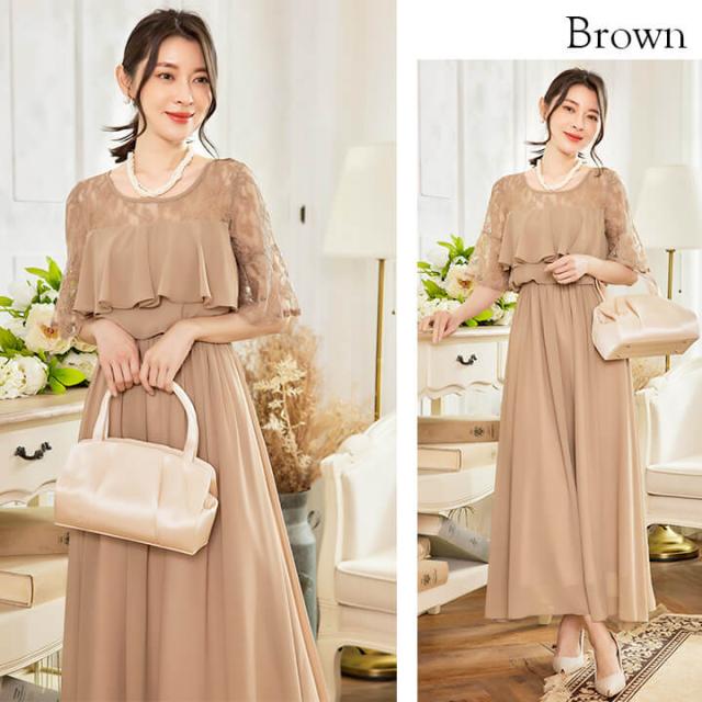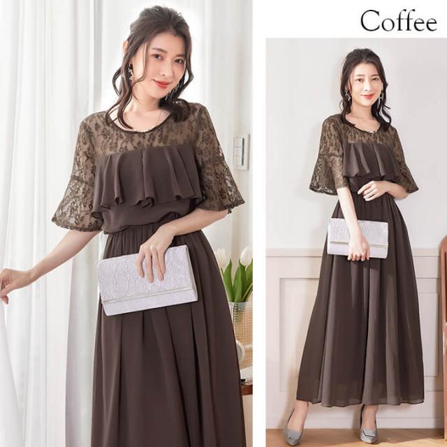 デコルテと袖を繊細レースで仕立てたふんわりシフォンロングドレス。