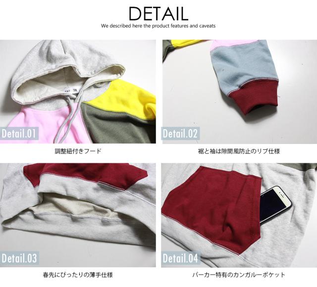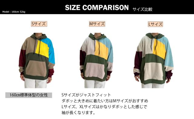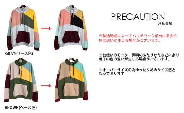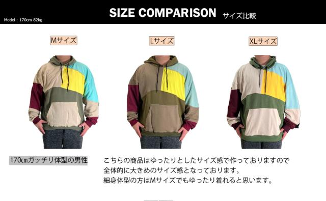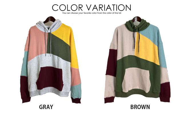 | 人気のクレイジーデザイン!! カラフルにパッチワークされたフードパーカー。トレンドのビッグシルエット。 薄手仕様のパイル生地 or 冬場にピッタリ暖かい裏起毛。 どちらも手触りの良いパーカーです。 |