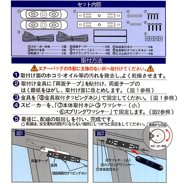 | 2WAY サテライトスピーカー スリムなボディで手軽に音域アップ 高音域・中音域を強化する2WAYスピーカー サテライトスピーカーは、リアの天井付近に設置することによって、 ドアなどに設置するリアスピーカーに比べ音の臨場感を出すことができます。 ミニバンなど、通常の位置だとリアスピーカーの音が遠くからこもって聴こえてくるような 広い車内の音場アップにオススメです。 また、スリムタイプなので車の状況に合わせてセッティングすることができます。 リスナーの近くにスピーカーを左右均等に設置することで 理想のリスニングポジションに近づきます。 スティックタイプスピーカー 取り付け場所を選ばない小型でスリムな円筒型のスピーカーです。 Aピラーやダッシュボード、後部席やBピラーなどに取り付けることができます。 2WAY・3スピーカー 2個のミッドレンジと1個のツィーターによる2WAY・3スピーカーで高音域・中音域を強化します。 ローカットフィルター お手持ちのスピーカーと合わせ、臨場感ある音場を実現しました。 バリアブルアングル 最適なリスニングポジションを簡単に角度調整することができます。 配線方法 お手持ちのスピーカーに接続します。 ワンタッチコネクターなどでプラスとマイナスを間違えないように接続してください。 取付方法 1.取り付け面のホコリやオイルなどの汚れを除去し、よく乾燥させます。 2.取り付け金具に両面テープを貼り付け、両面テープのはく離紙をはがし、 取り付け面に仮止めします。 3.金具を、金具取り付けタッピングネジで固定してください。 4.スピーカーを本体取り付けネジ・ワッシャー(小)・スプリングワッシャーで固定します。 5.最後に配線の取り回しを行い、完成です。 配線は安全運転の妨げにならない箇所にしっかりと固定してください。 【商品詳細】 サイズ:(約)17.5×3.5×4cm、ミッドレンジ (約)2.5×4cm、ツィーター (約)2cm 重量:(約)150g ※1本辺り スピーカー型式:スティックタイプ・チューンアップスピーカー(2本1組) ミッドレンジ:アルミ蒸着PEパラボリックドーム×2 ツィーター:アルミ蒸着PEIバランスドライブ 瞬間最大入力:80W 定格入力:20W 出力音圧レベル:83dB 再生周波数帯域:300Hz〜35KHz 付属品:スピーカー本体×2個、取付金具×2枚、配線コード×2本、両面テープ×2枚、 ワッシャー(小)×4枚、スプリングワッシャー×4枚、本体取付ネジ×4本、 金具取付タッピングネジ×4本、ビス止めクリップ×4枚 |