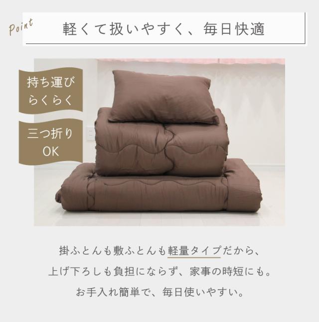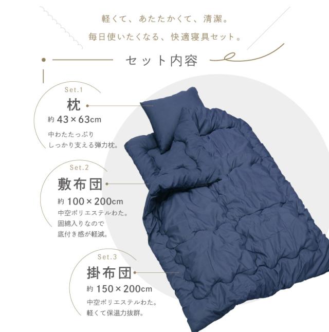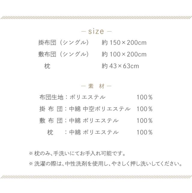 ◆size:掛布団シングル 約150X200cm 敷布団シングル 約100X200cm 寝やすい低めの枕 約43X63cm