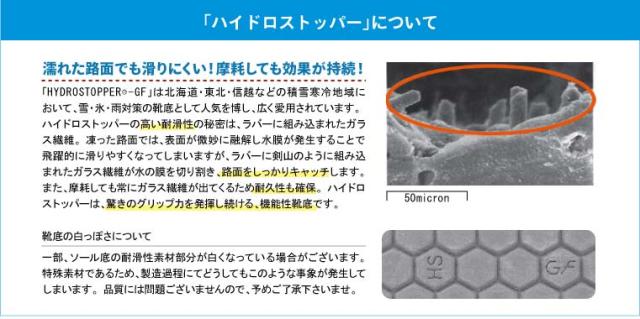 ガラス繊維が剣山のように配列された耐滑性ラバー[ハイドロストッパーGF]を使用し、雨や雪・氷に濡れた地面でも滑りにくい!