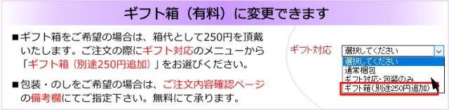 こちらの商品は、ギフト用の箱を有料にてご用意しております。大切な方への贈り物にぜひご利用ください。(包装・のしにつきましては、無料にてお承りいたします) ご注文の際には「ギフト対応」のメニューから『ギフト箱(別途250円追加)』をお選びください。