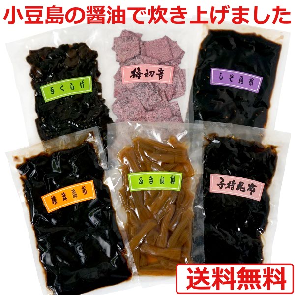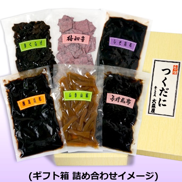 ■セット内容 : 子持ち昆布 / しそ昆布 / きくらげ / ふき山椒 / しいたけ昆布 / 梅初音(汐吹梅昆布) 各1袋