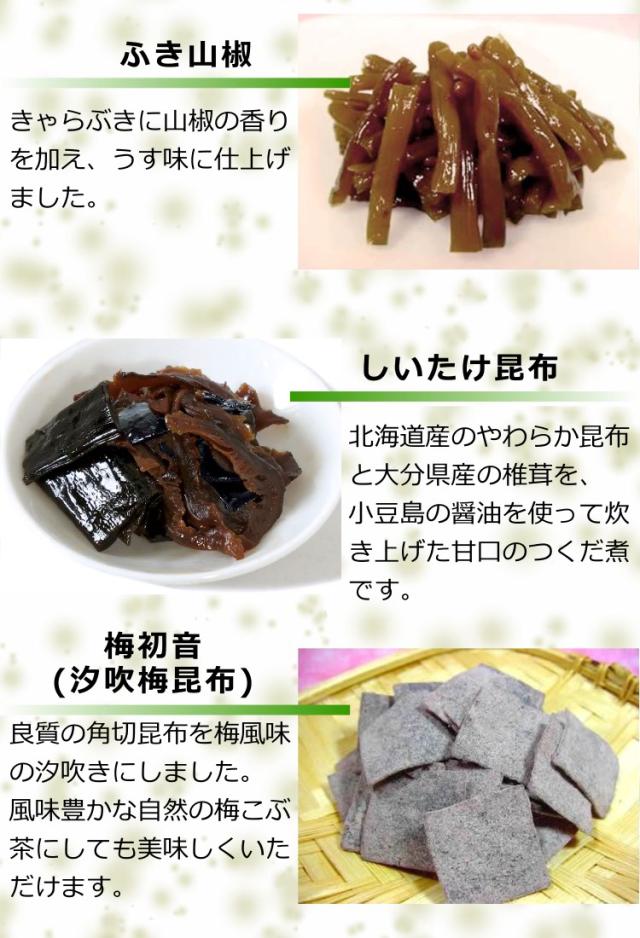 | ■セット内容: | 子持ち昆布、しそ昆布、きくらげ、ふき山椒、しいたけ昆布 / 梅初音(汐吹梅昆布) 各1袋 |