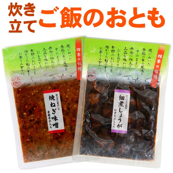 | ■商品内容: | 焼ねぎみそ / 佃煮しょうが 各1袋 |