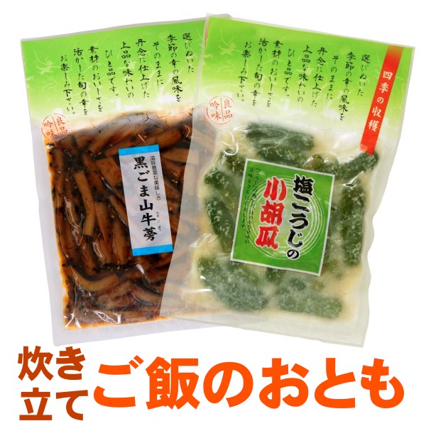 | ■商品内容: | 塩こうじの小胡瓜 / 黒ごま山ごぼう 各1袋 |