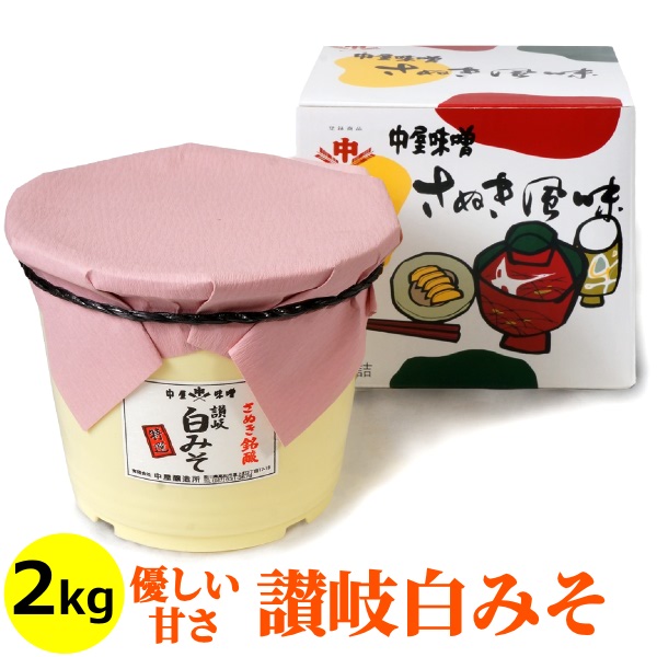 瀬戸の風土が育んだサヌキ白みそは、米こうじたっぷりの甘口みそです。讃岐では、お正月のお雑煮に白みそを使います。 また、白合えなどのお料理にも多く使います。 たっぷり2kgの樽詰め・化粧箱入りで、ご贈答用にもピッタリです。// 白みそ 白味噌 みそ 味噌 讃岐 化粧箱 ギフト 贈答 中屋味噌