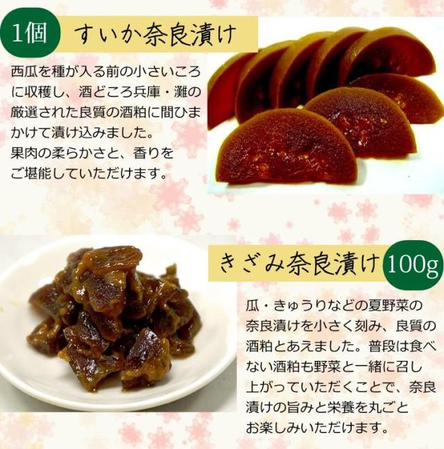 ■セット内容 : 守口大根 奈良漬 110g / きゅうり 奈良漬け 2本 / 樽出し 白瓜 奈良漬け 半舟 / すいか 奈良漬け 1個 / きざみ奈良漬け 100g