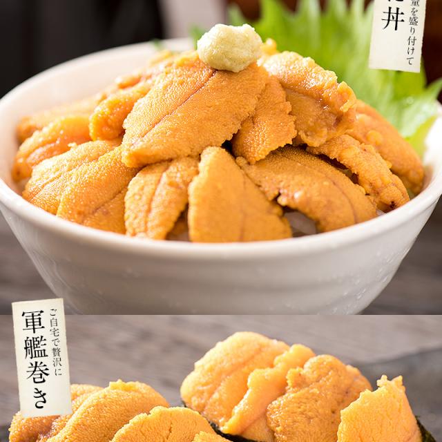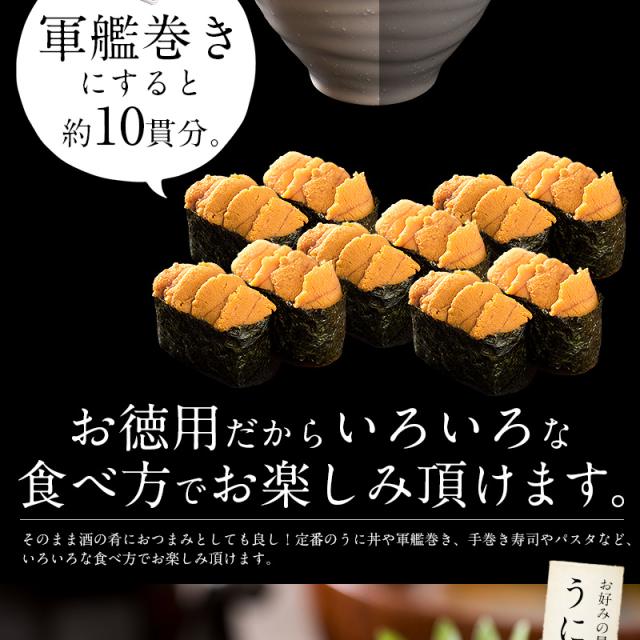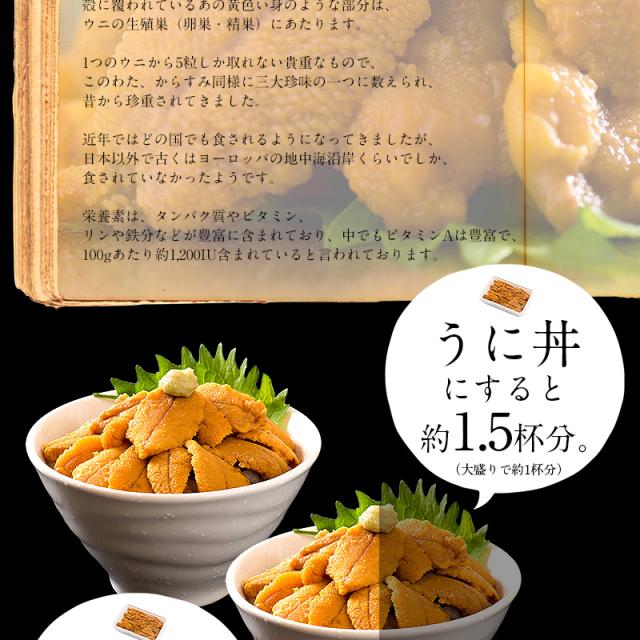 100g(100g×1パック)ウニ丼で約1.5杯、軍艦巻きで約10貫分相当