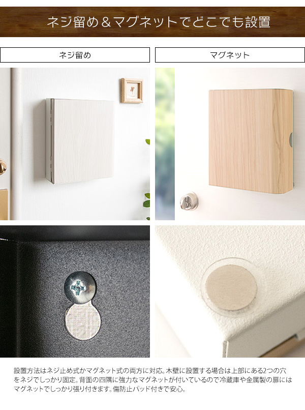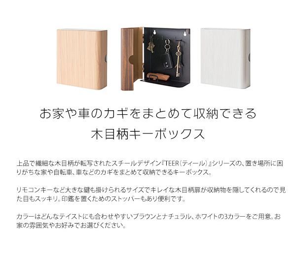 上品で繊細な木目柄が転写されたスチールデザイン『TEER(ティール)』シリーズの、置き場所に困りがちな鍵類をまとめて収納できるキーボックス。