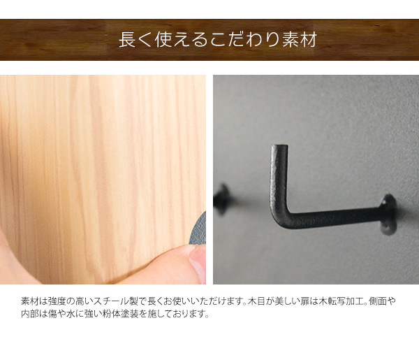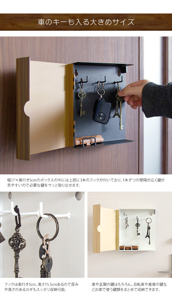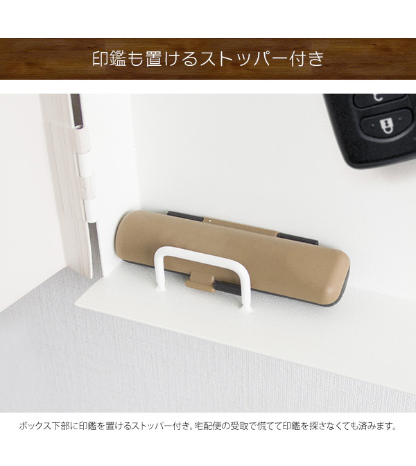 リモコンキーなど大きな鍵も掛けられるサイズでキレイな木目柄扉が収納物を隠してくれるので見た目もスッキリ。印鑑を置くためのストッパーもあり便利です。