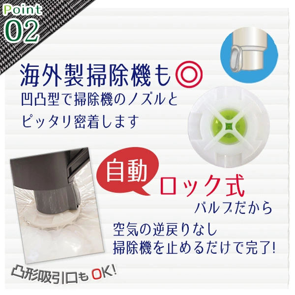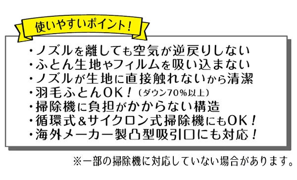 | 備考 | 【収納めやす(1袋あたり)】 ・シングル掛けふとん:1枚 ・ダブル掛けふとん:1枚 ※ふとんの大きさ・厚み等により異なる場合があります。 ※一部の掃除機に対応していない場合があります。 |