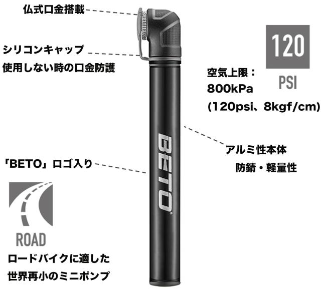 【BETO国内正規品】 世界最小 ミニポンプ 自転車 空気入れ 仏式バルブ対応 携帯用ポンプ 空気ポンプ 120psi PVP-003ABK