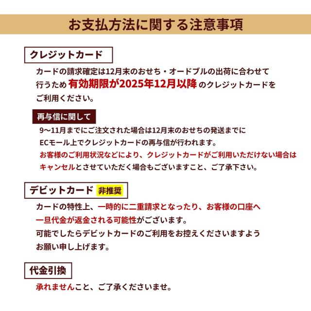 カードの請求確定は12月末のおせちの出荷に合わせて行いますので、