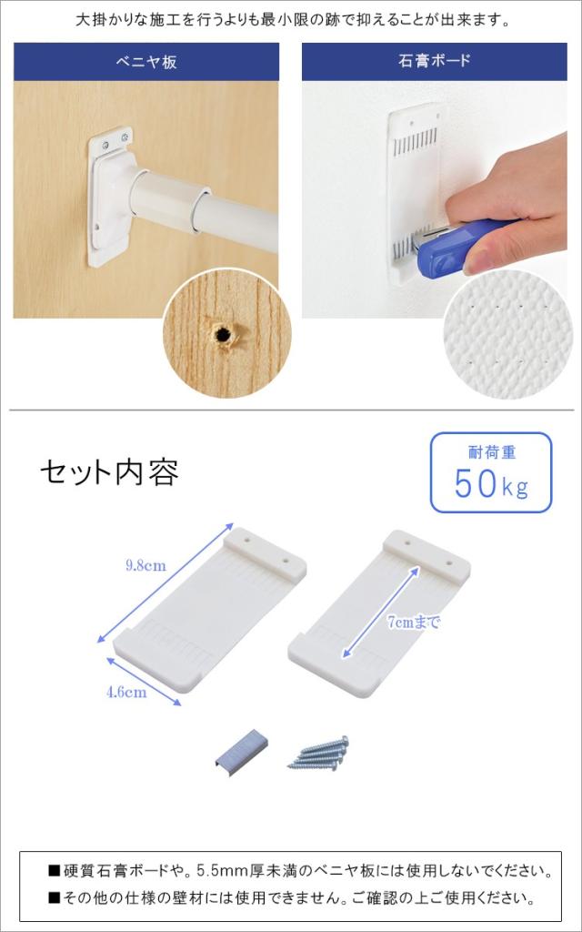 石こうボードやベニヤ板に固定する事で、突っ張り棒や突っ張り棚を強力に支えます。
