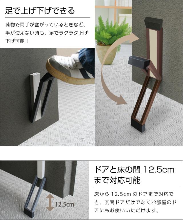 - 玄関ドアは金属製だが、付属の金属プレートを貼れば寄り強力に貼り付く、利用は方足でセットも収納も簡単に出来る、片手に荷物で、反対の手で解錠してドアを開放、方足でストッパーをセット、用途が済めば片手でドアハンドルを持ち方足でストッパーを収納、手も汚さず楽チン動作に簡単設置。