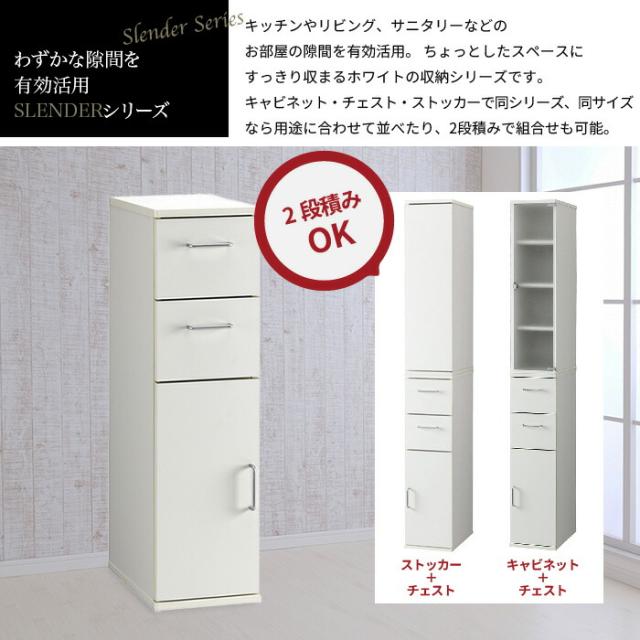 | わずかな隙間を有効利用出来ます。 キッチンや洗面所のデッドスペースにぴったりフィット。 下部収納スペースには2Lペットボトルが幅25サイズ:6本収納可能。 扉内は隠して置きたい小物類をすっきり収納出来ます。 スレンダーシリーズ同サイズのストッカー、キャビネット、チェストと組み合わせも可能。 (チェストは下部設置のみ)引き出し2杯。 (プラステックレール) |