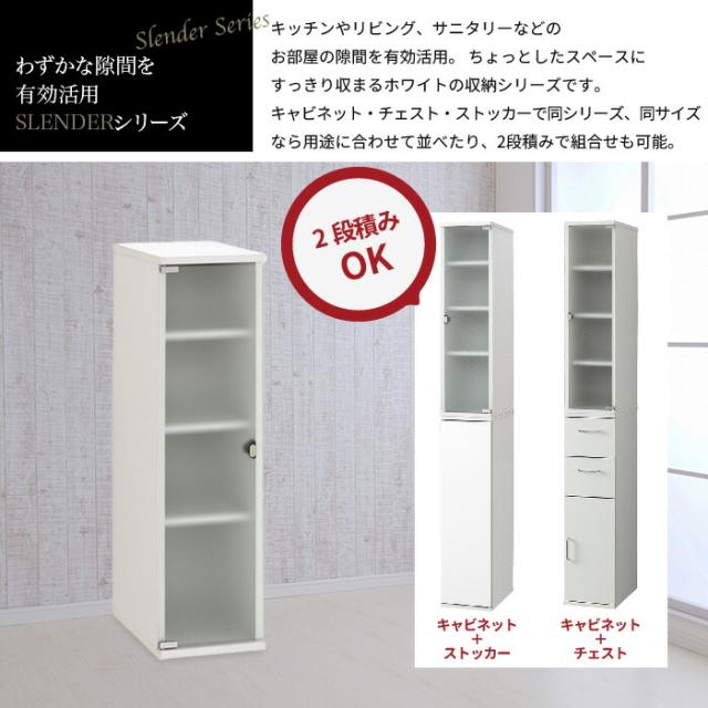 | わずかな隙間を有効利用出来ます。 キッチンや洗面所のデッドスペースにぴったりフィット。 扉は左右開きどちらでも組立時に選択可能。 スレンダーシリーズ同サイズのストッカー、キャビネット、チェストと組み合わせも可能。 (チェストは下部設置のみ) |