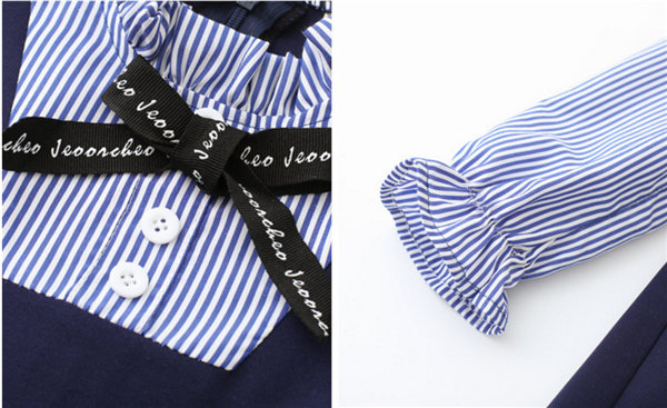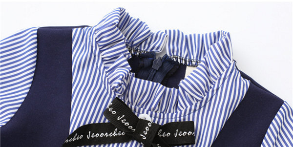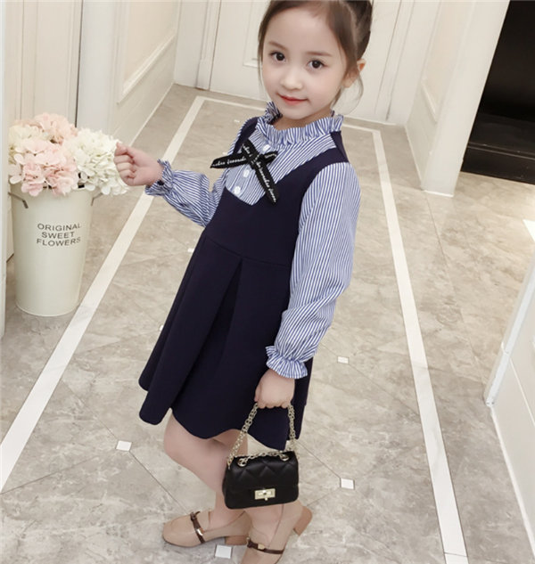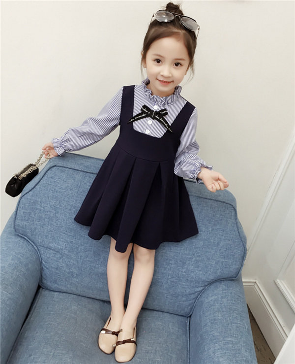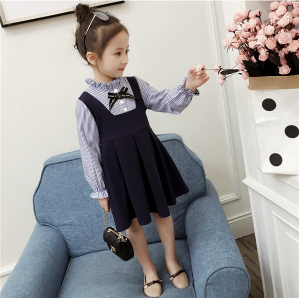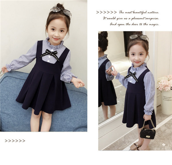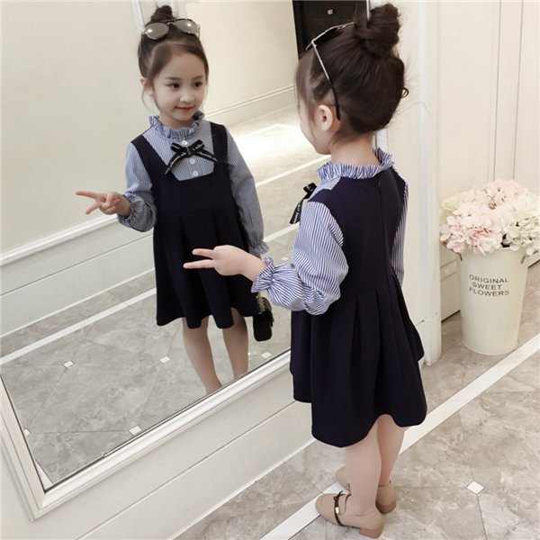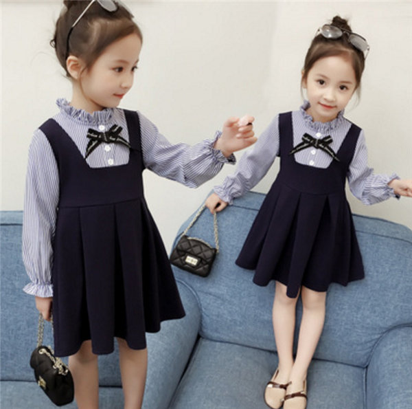 メ便送料無料 ワンピース 女の子 春秋冬 子供 キッズ ボーダー柄 リボン ワンピース フェイクレイヤード 長袖ワンピース ジュニア