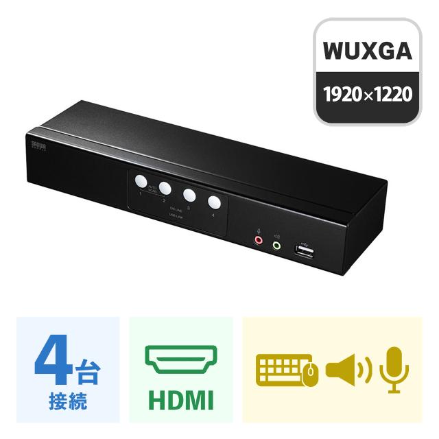 ●1組のHDMIディスプレイ・USBキーボード・USBマウスで4台のパソコンを切り替えて使用できます。●HDMIディスプレイは最大解像度1920×1200(WUXGA)、1920×1080(フルHD)に対応し、ワイド画面出力にも対応します。