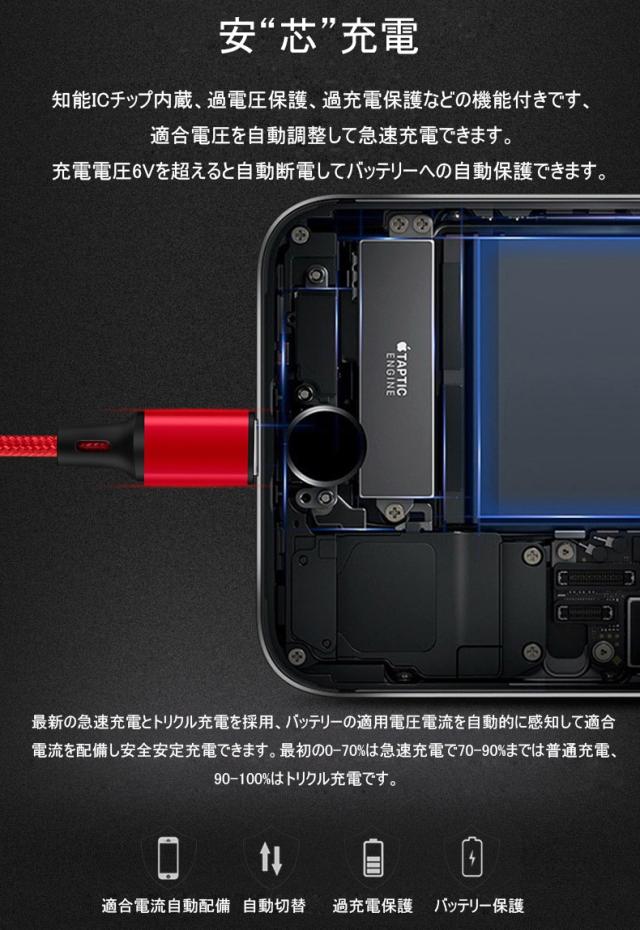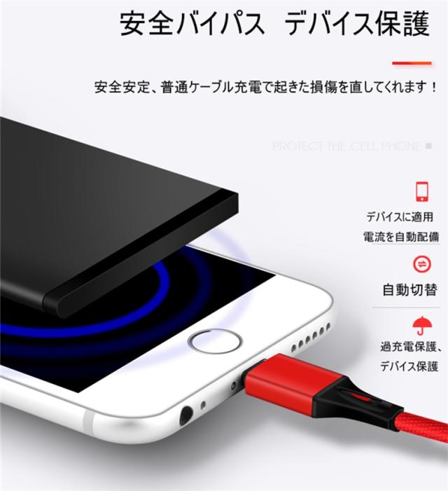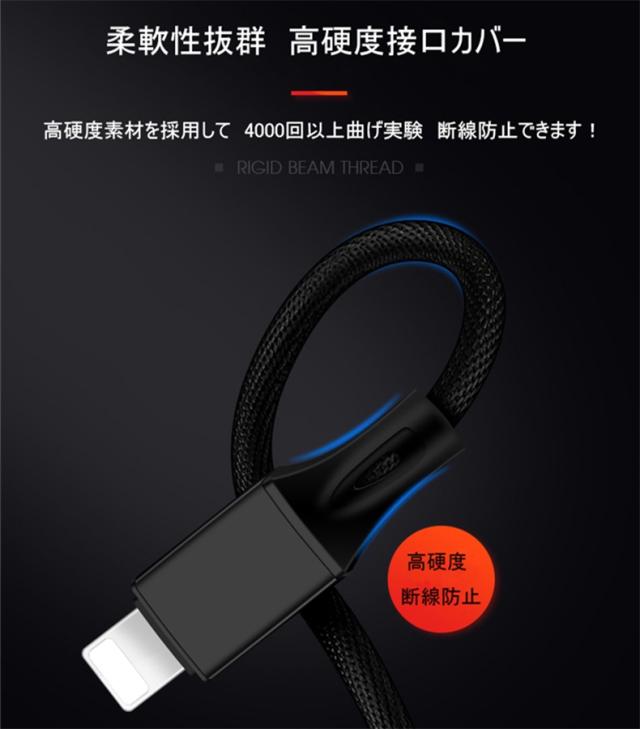 柔軟性抜群で断線*防止!4000回以上曲げ実験で安心に使用して頂けます。過充電保護、電圧保護、バッテリー保護機能付、適合電流を自動的に感知して流、純銅電芯で普通のケーブルより充電スピード40%UP!